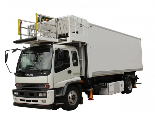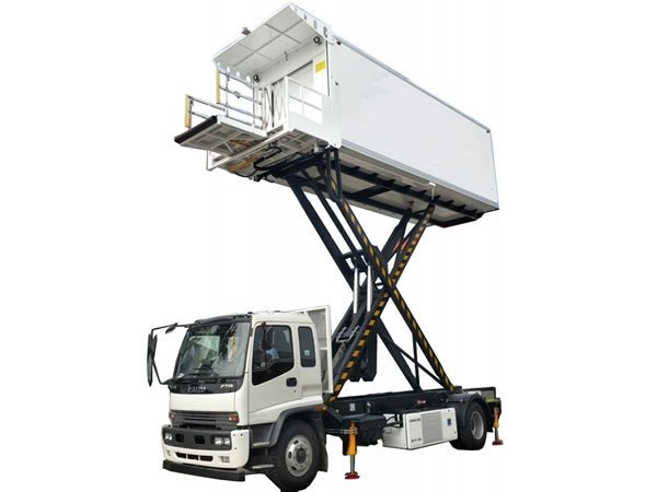 شاحنة تموين الطائرات تتكون بشكل رئيسي من الشاسية، وحدة الرفع، الباب الحراري، العربة، ركائز الدعم والتثبيت، منصة العمل، النظام الهيدروليكي/ النظام الكهربائي، ووحدة التبريد.